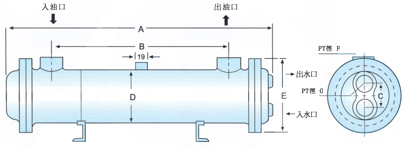 形式編號 A B C D E F G 散熱管 散熱面積 油箱容量 重量 泵浦流量 水流量